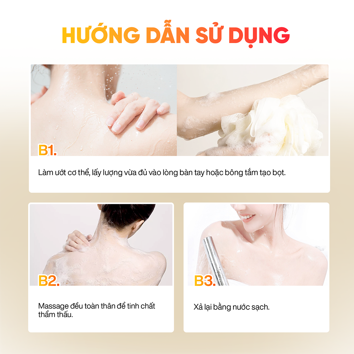 Làm ướt cơ thể, lấy lượng vừa đủ vào lòng bàn tay hoặc bông tắm tạo bọt, massage đều toàn thân. Xả lại bằng nước sạch.